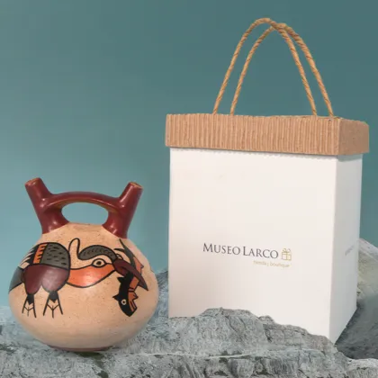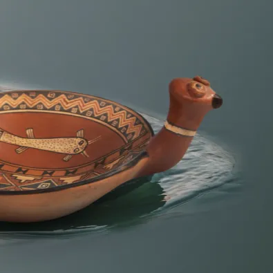 Botella escultórica de cerámica de color negro y con incrustaciones de nácar que representa un animal mitológico.