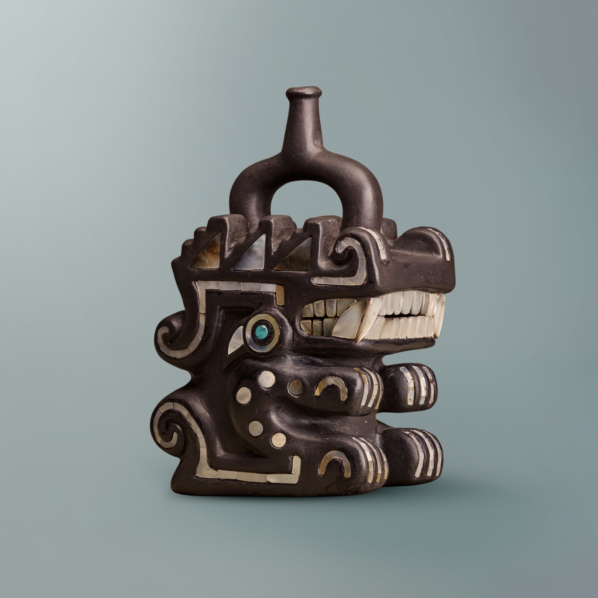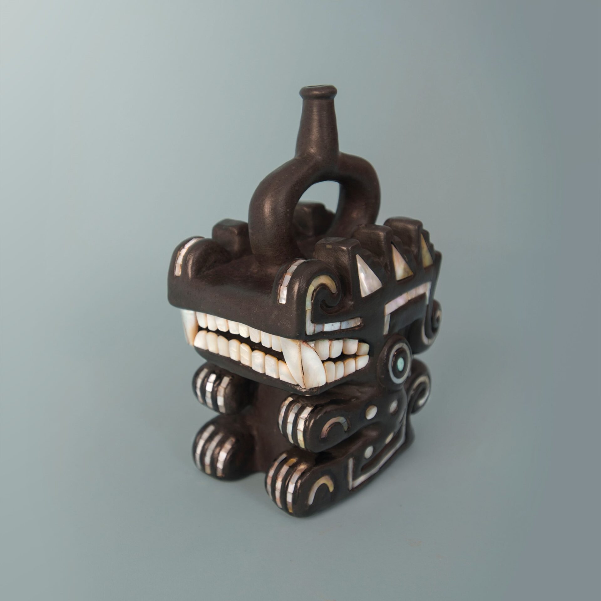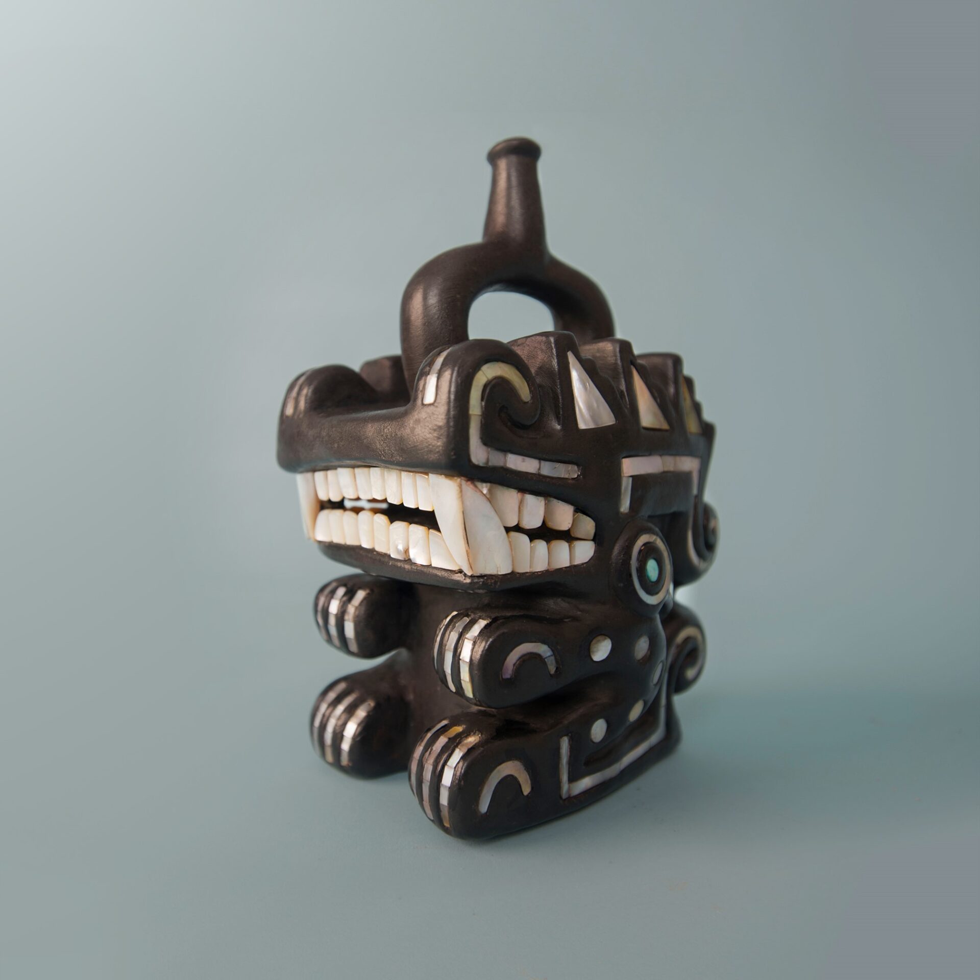 Réplica de vasija de cerámica (huaco) escultórica de cerámica de color negro y con incrustaciones de nácar que representa un animal mitológico. Su ojo está representado por una incrustación de piedra turquesa. Es conocido como animal lunar o felino rampante. Se trata de un animal híbrido que representa el vínculo entre los diferentes mundos, ya que tiene cuerpo y colmillos del felino, rostro y orejas de zorro, crestas de ave, y en algunos casos presenta prolongaciones en forma de serpientes.