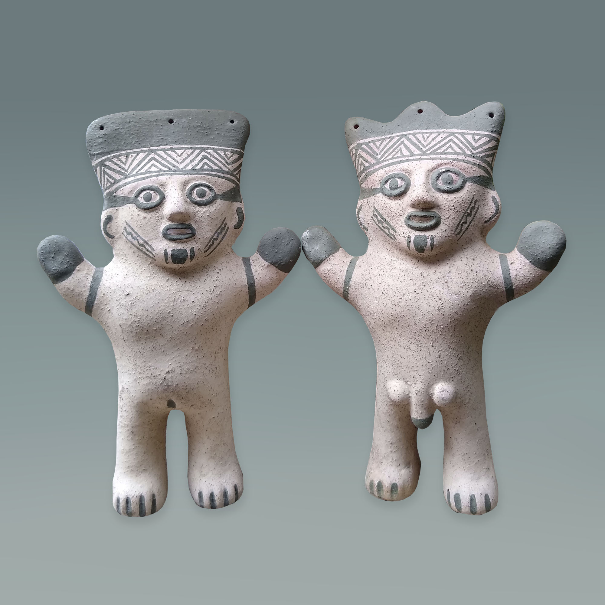 Réplica de vasija de cerámic (huaco) que representan a hombres y mujeres en posición parados con los brazos levantados.